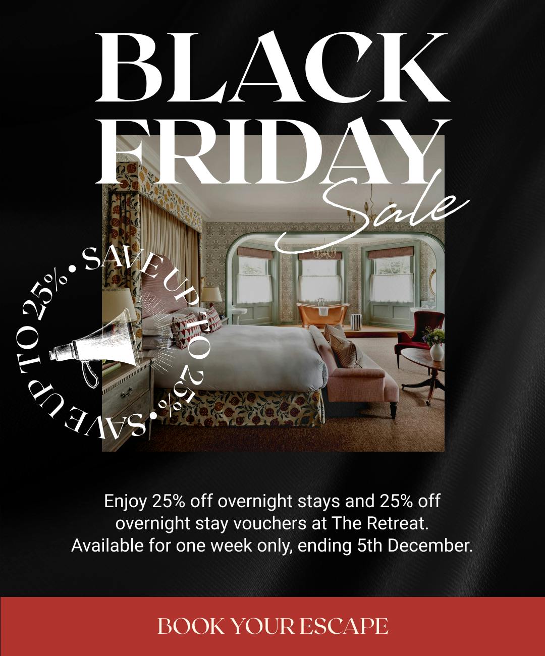 Enjoy 25% off all stays and vouchers this Black Friday, available until 5th December. Your seasonal escape, wrapped up with a little extra sparkle.